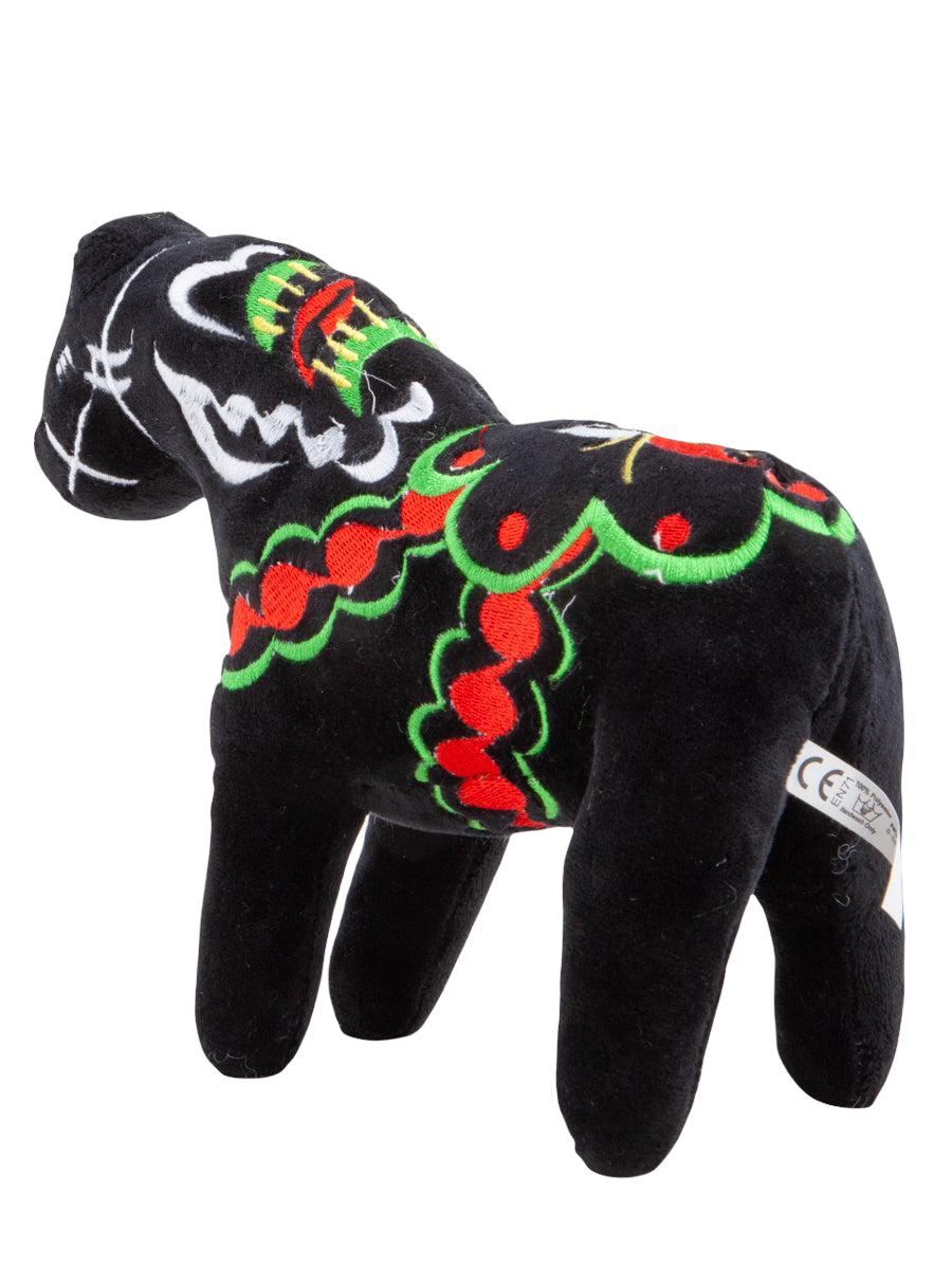 En mjuk och färgstark Dalahäst i klassisk svart färg – ett av Sveriges mest älskade symboler, nu i ett gosigt plyschformat.